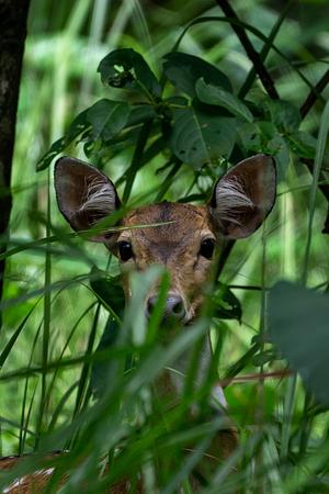 While a herd of spotted deers grazes silently one of the deer stays on the lookout.