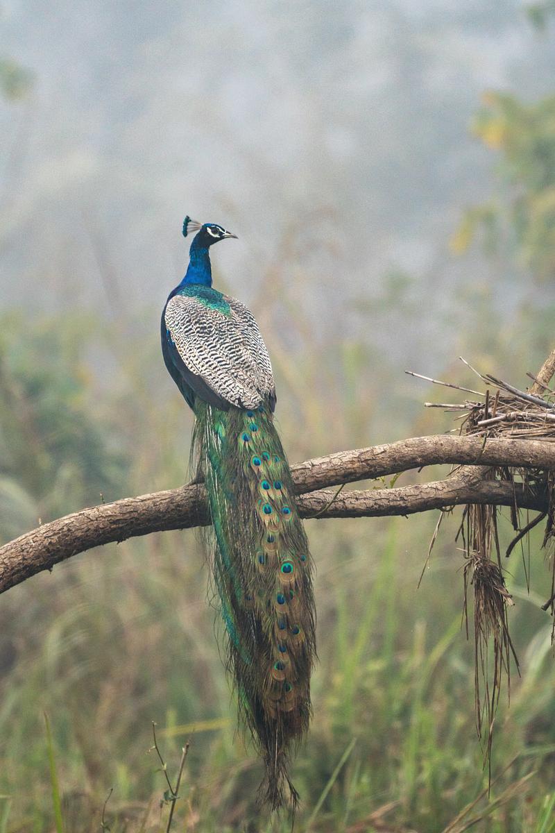 On a winter morning as the fog slowly moves out, a male Peafowl (Peacock) sits on the fallen tree after foraging around the grassland.